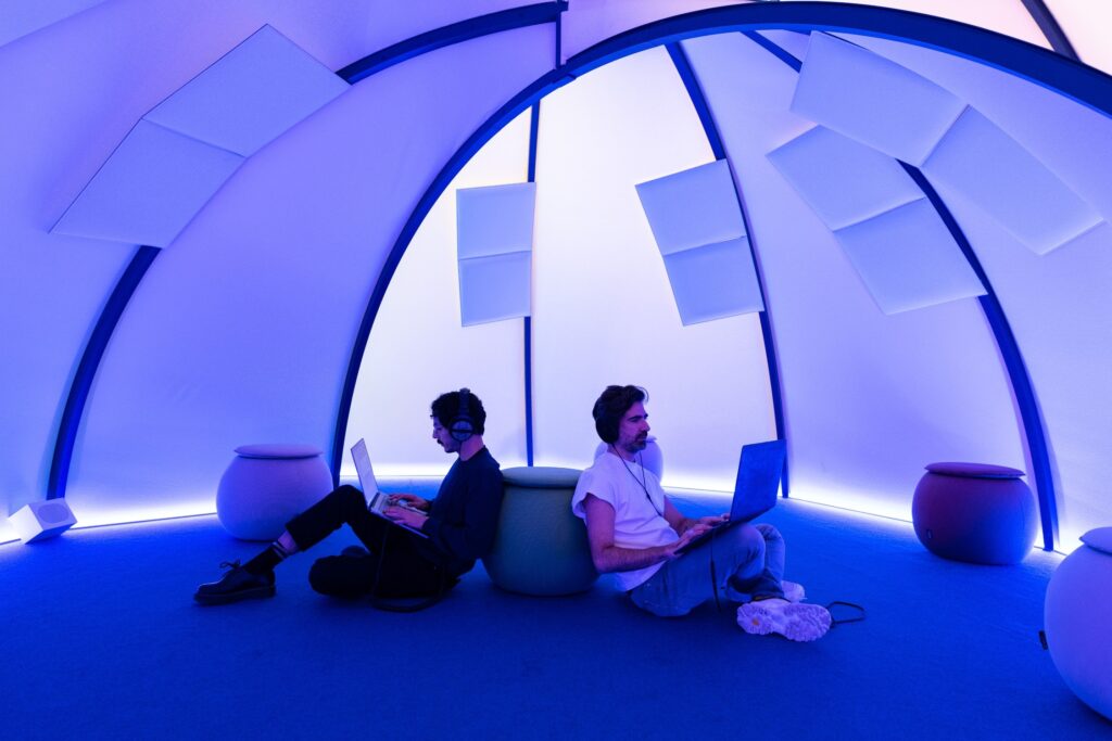 Entrando nella “core chamber” della struttura si raggiunge uno spazio più isolato acusticamente, grazie all’inserimento di pouf e pannelli rivestiti di tessuto fonoassorbente, che garantiscono maggiore confort dal punto di vista acustico. Il visitatore si sentirà sicuro e a proprio agio, godendo della propria presenza ed essendo consapevole di ciò che lo circonda.