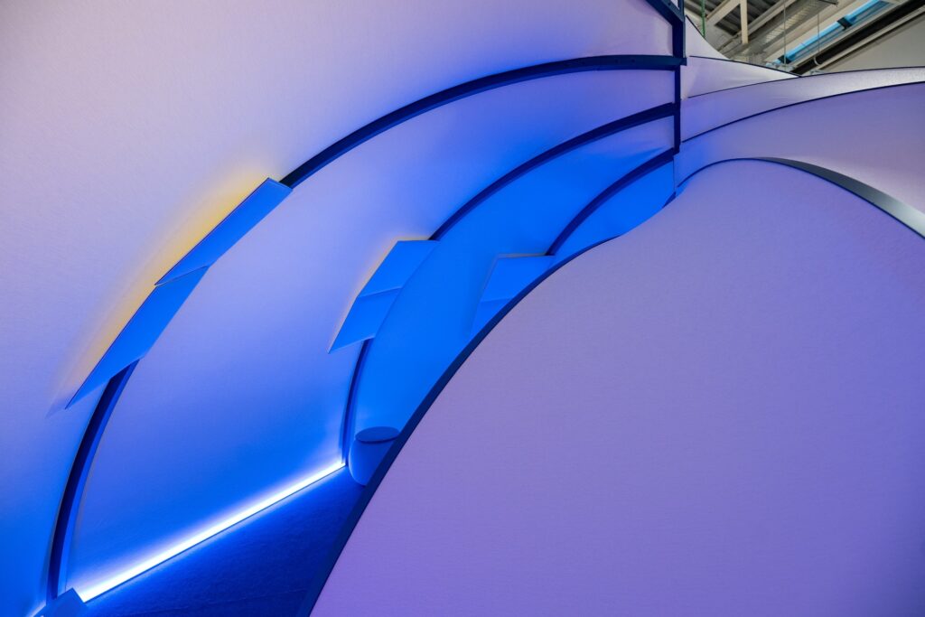 La struttura è interamente rivestita in tessuto fonoassorbente. La tecnologia brevettata Snowsound-Fiber è basata su morbide fibre di poliestere al 100% interconnesse tra loro e intrinsecamente ignifughe. L ’interazione tra le fibre di Snowsound-Fiber e l ’aria permette di controllare il riverbero, regolando con precisione la risposta acustica, in base alla modalità di posa, alla superficie e alla distanza tra la fibra acustica e la parete. Nella sezione centrale dell ’installazione sono stati aggiunti inoltre pannelli fonoassorbenti e per gli arredamenti interni sono stati utilizzati elementi di Snowpouf, rivestito in Snowsound Fiber 12, uno speciale tessuto fonoassorbente che impiega nella produzione per la prima volta il filo ECONYL®, nato dalla rigenerazione dei rifiuti di nylon provenienti da tutto il mondo, come reti da pesca o moquette usate. Un ringraziamento anche ad Artemide per l’installazione di luce con il prodotto La Linea 25, un tubo di luce flessibile in grado di ruotare liberamente nello spazio secondo geometrie indefinite, diventando così uno strumento comunicativo oltre che funzionale, aggiungendo valori e significati alla sua luce attraverso l’espressività del suo segno grafico.