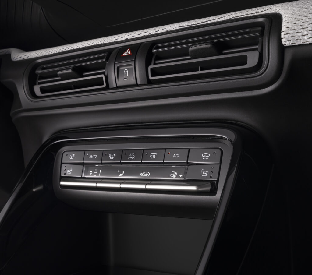 Lo spazioso abitacolo è stato realizzato con superfici semplici ma raffinate per offrire agli occupanti un ambiente lounge simile a quello del salotto di casa. I nuovi sedili Citroën Advanced Comfort® di Nuova ë-C3 sono stati progettati su misura per l’auto e utilizzano una schiuma aggiuntiva per offrire una sensazione accogliente e confortevole fin dal primo contatto e un buon supporto durante i viaggi, su qualunque distanza. Il nuovo design, caratterizzato da un’altezza di 1,57 m, offre agli occupanti dei sedili anteriori 100 mm in più di spazio per la testa, per una posizione di guida più alta e dominante, e una maggiore sensazione di controllo e sicurezza. Tutti beneficiano di una maggiore visibilità verso l’esterno, che contribuisce ad aumentare la sensazione di benessere a bordo. Infatti, Nuova ë-C3 propone un abitacolo decisamente più spazioso rispetto al modello precedente, nonostante sia solo 19 mm più lunga e 6 mm più larga. Lo spazio ai gomiti per i passeggeri posteriori è superiore di 19 mm e per gli occupanti anteriori è maggiore di 21 mm rispetto alla media del mercato, mentre lo spazio per le ginocchia dei passeggeri posteriori è il migliore della categoria, almeno 20 mm in più rispetto alla media. Trasportare oggetti e bagagli è facile a bordo di Nuova ë-C3. L’abitacolo, più alto, è ricco di vani portaoggetti utili e pratici sui pannelli delle porte, sulla console centrale e sotto il bracciolo centrale, mentre la console centrale è provvista di un tappetino di ricarica wireless (di serie sulle versioni “Max”). La comoda modularità degli schienali posteriori frazionabili 60-40 (di serie sulla versione Max) e la larghezza tra i passaruota posteriori di 1015 mm consentono di trasportare oggetti di grandi dimensioni ogni qualvolta necessario, mentre i generosi 310 litri di volume del bagagliaio dietro i sedili posteriori sono sufficienti per la maggior parte delle uscite per lo shopping.