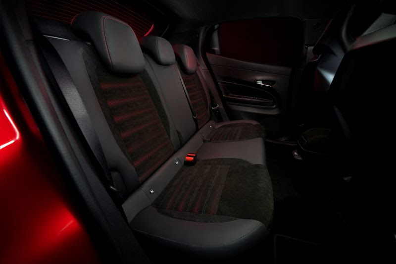 Alcantara, di colore nero per il centrale delle sedute con una lavorazione traforo di forma tonda a dimensione scalare, su un backing rosso e cuciture rosse, conferisce un effetto tattile ed estetico degradé estremamente sportivo.