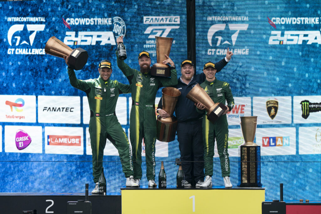 Il precedente miglior piazzamento di Aston Martin alla 24 Ore di Spa nell’era GT3 risale al 2021, quando Gunn, Sørensen e Thiim ottennero un discreto terzo posto, dopo essere stati in testa per gran parte della gara. Prima di allora, il miglior piazzamento in GT per una Aston Martin era stato il terzo posto, nel 2008, con la Gigawave DBR9 GT1. L’ultima vittoria di Aston Martin risale al 1948, quando la gara si svolgeva con regole diverse, con una DB1 2 litri Sport guidata dai britannici St John Horsfall e Leslie Johnson.
