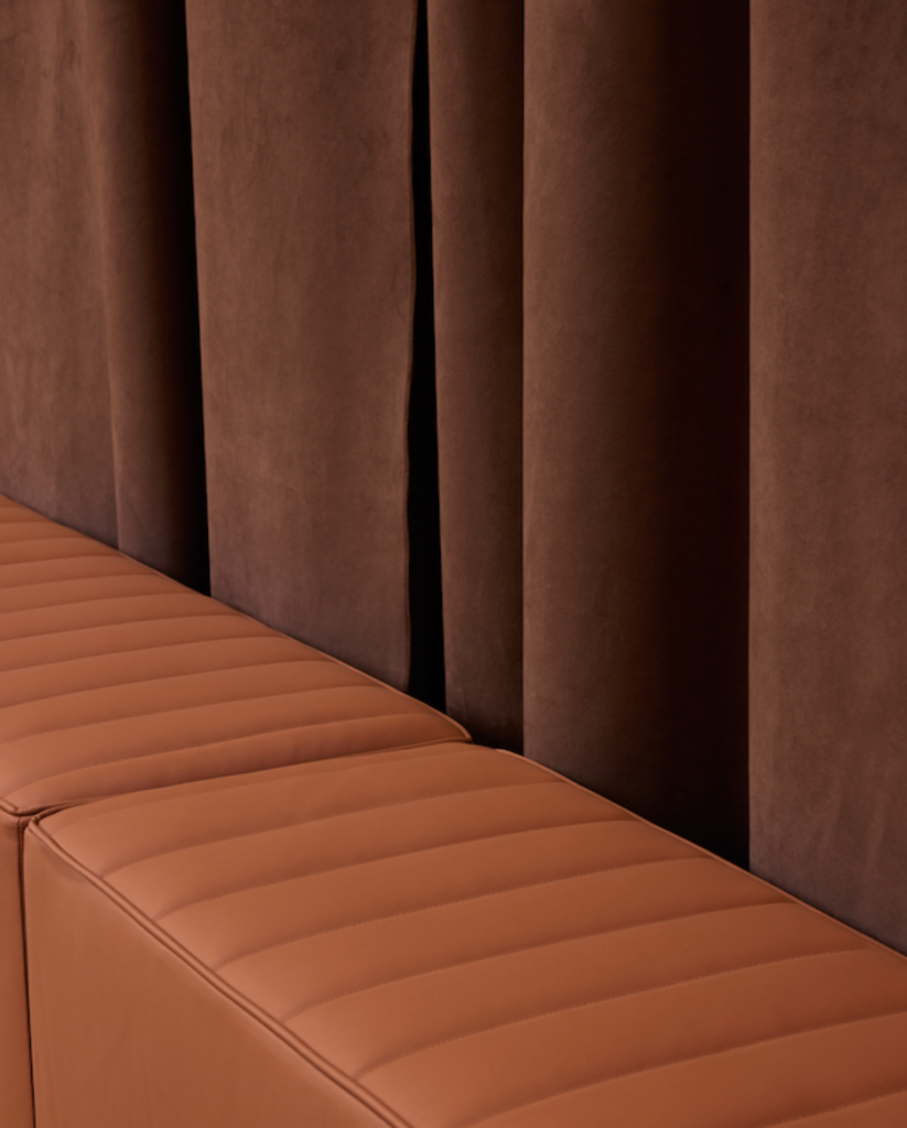 In perfetta coerenza con il DNA del brand, Iannone ha scelto Alcantara per creare questo spazio prezioso, caldo, accogliente e avvolgente, pensato anche per offrire un intimo punto di vista, come se lo spettatore si godesse lo show dall’interno di una super car rigorosamente in Alcantara. Tendaggi nell’iconico Rosso Corsa accolgono gli ospiti mentre una luxury box nella nuance Oud fa da cornice allo show.