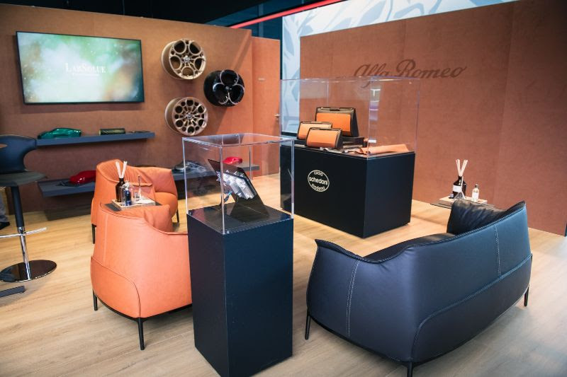 L’area espositiva dello stand, denominata “Bottega” Alfa Romeo, trasporterà i visitatori in un viaggio immersivo nel cuore del Made in Italy, celebrando l’eccellenza artigianale e la sua tradizione culturale. Le pareti dello stand sono rivestite con Alcantara nel colore Palm, una tonalità cammello con sfumature che virano al rosato. Questo colore è stato scelto per il suo potere evocativo: rappresenta il calore dell’artigianalità italiana, l’eleganza senza tempo e la connessione con la natura, richiamando i toni della terra e delle dune desertiche. La tonalità cammello con accenti rosati conferisce un senso di comfort e raffinatezza, creando un ambiente accogliente e ricercato tipicamente italiano.