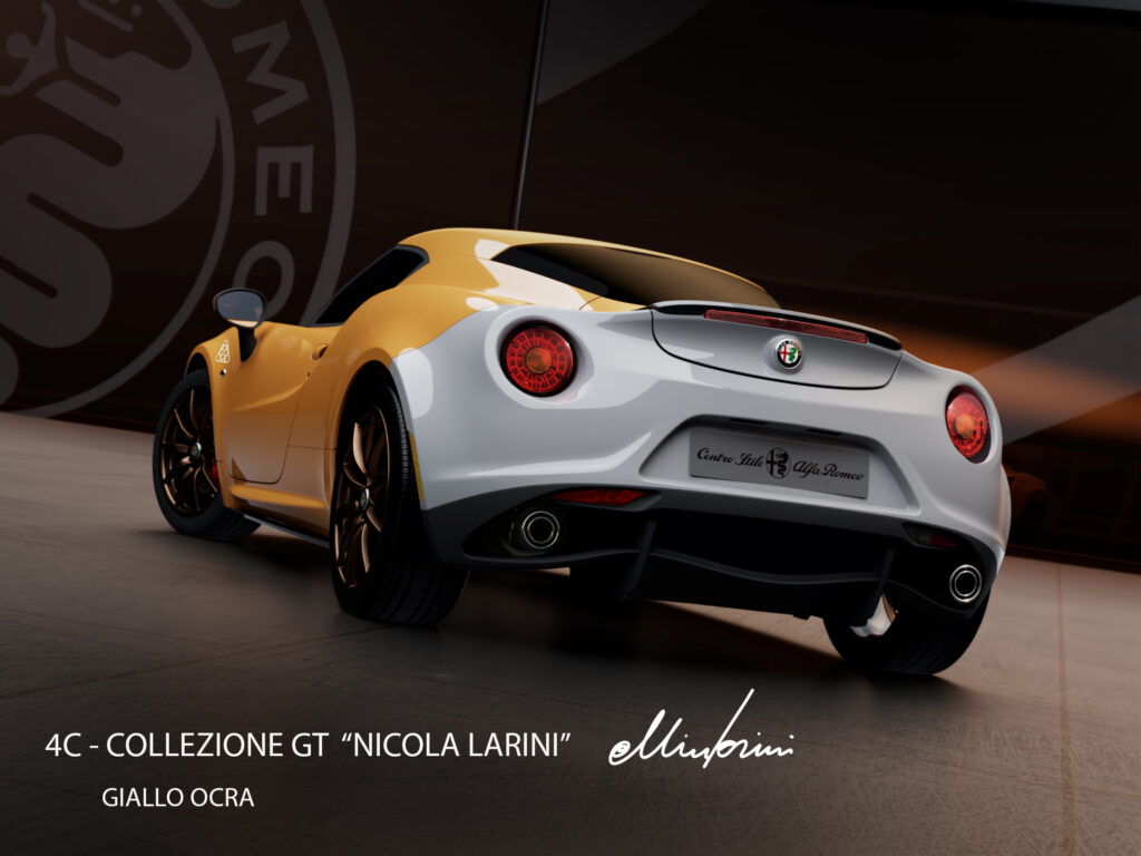 Realizzate nell’ambito del programma “Reloaded by Creators” di Stellantis Heritage, le tre esclusive 4C “Nicola Larini” sono il risultato della trasformazione di auto esistenti  Nel caso specifico, un ruolo determinante lo giocano le tre accattivanti livree, una per ciascuna vettura, che il pilota toscano ha selezionato insieme a Stellantis Heritage e il Centro Stile Alfa Romeo, e rendono omaggio alla tradizionale audacia del brand italiano nella scelta di colori distintivi e dalla forte personalità. Infatti, prendendo ispirazione dalle livree originali dell’iconica Giulia GT degli anni Sessanta, le tre tonalità scelte per la 4C – Collezione GT “Nicola Larini” sono il Verde Pino, il Rosso Prugna e il Giallo Ocra, tutte accentuate da inserti bianchi posti sul frontale e sulla coda posteriore.