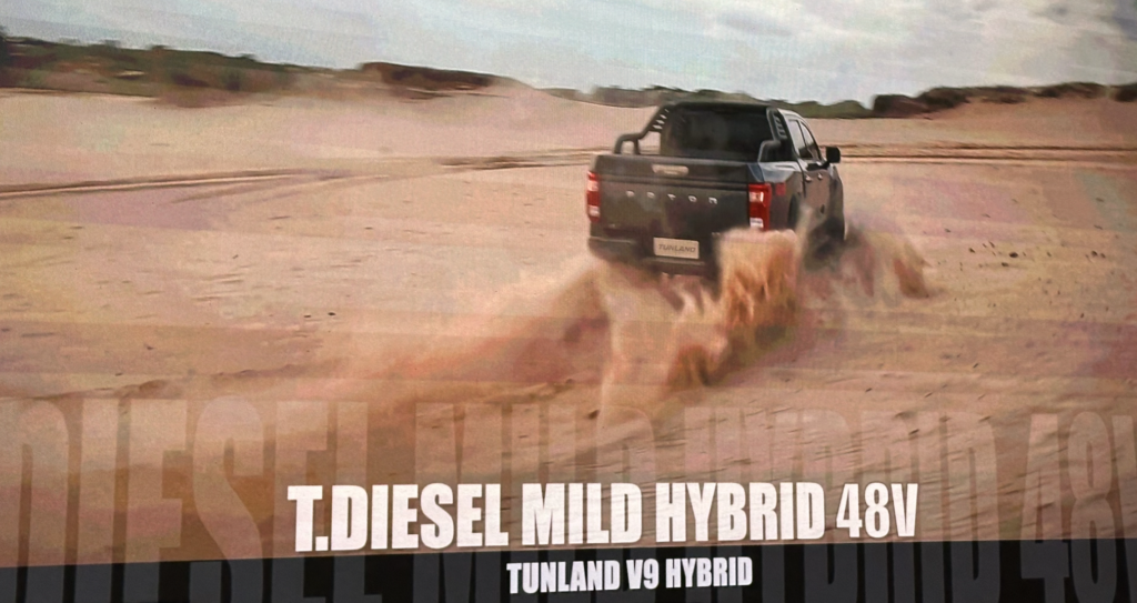 L’abitacolo del Tunland V9 è dotato di illuminazione ambientale a LED, mentre i sedili sono progettati per offrire il massimo comfort grazie alla loro forma ergonomica. Utilizzano imbottiture di alta qualità e hanno una finitura raffinata; gli schienali sono leggermente rialzati sui lati per un supporto extra e, in particolare, il sedile del conducente presenta 10 regolazioni incluso il supporto lombare. Uno dei punti di forza del nuovo pick-up è il suo motore, ibrido. Il motore diesel Aucan 4F20 di Foton, 2.0 con 160cv, è leggero, potente e a basso consumo di carburante, ha incluso un turbocompressore a geometria variabile BorgWarner e un sistema di iniezione common rail ad alta pressione Bosch, oltre a tecnologie come doppi alberi di bilanciamento e un intercooler raffreddato ad acqua. Il motore diesel eroga una potenza massima di 117kW a 3600 giri/min e una coppia massima di 400 Nm a 1500-2400 giri/min, a cui si somma il contributo del sistema ibrido 48V con motore Bosch che aumenta la coppia a bassa velocità di 50 Nm. Grazie al sistema ibrido, quindi, la coppia massima disponibile a soli 1500 giri sale a 450 Nm. In questo modo Tunland V9 supera gli altri veicoli da 2,0 litri della sua categoria, offrendo un’accelerazione più rapida e una potenza maggiore, riducendo di 2,8 secondi il tempo necessario per accelerare da 0 a 60km/h. Il sistema ibrido Bosch da 48 V consente al motore di recuperare energia e ricaricare la batteria. Il motore elettrico interviene in cinque condizioni di guida: partenza, accelerazione, salita, decelerazione in discesa e arresto. Durante partenza, accelerazione e salita il motore elettrico interviene per fornire ulteriore supporto di potenza al veicolo, durante la decelerazione in discesa, il motore esegue il recupero di energia per ricaricare la batteria, che la immagazzina per la successiva accelerazione.