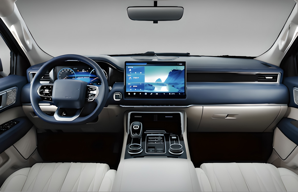 All’interno, Foton Tunland V9 predilige il massimo del comfort. Combina tecnologia moderna con materiali di alta qualità, creando uno spazio minimalista ma elegante, comodo e intelligente. Innanzitutto, il volante multifunzione presenta una forma a “D” per uno spazio extra per le gambe, rendendo più facile salire e scendere. Si regola in quattro direzioni per una posizione di guida comoda, riducendo l’affaticamento e migliorando la sicurezza. Il volante multifunzione include tutti i comandi utili a una guida rilassata: pulsanti per il menu principale, cruise control, comandi per il sistema audio e il Bluetooth, nonché per le telefonate. Dietro al volante, il display multifunzione LCD presenta una varietà di interfacce utili, come avvisi sulle porte, pressione degli pneumatici e promemoria del cambio marcia, fornendo una visione chiara di tutti i dati di guida. L’indicatore SOC (stato di carica) al centro indica il livello della batteria del veicolo, aiutando a gestire le prestazioni e a migliorare la guida. Sulla plancia, il touchscreen centrale multifunzione da 14,6 pollici ha un design elegante e minimalista che mette in risalto la sua tecnologia avanzata. Con una risoluzione di 1920×1080 e un display Retina 2K, garantisce immagini nitide e chiare. Esso supporta l’attivazione vocale e il collegamento al cellulare tramite CarPlay, permettendo di gestire molte delle funzioni principali dell’auto. Al di sotto della plancia, il cambio ha un design elegante ed è facile da usare. Si può regolare la trazione integrale e le modalità di guida per adattarle a diverse condizioni stradali e in tale sede si trovano i pulsanti del controllo della stabilità, dell’assistenza in salita e per lo start-stop, oltre che il pad di ricarica.