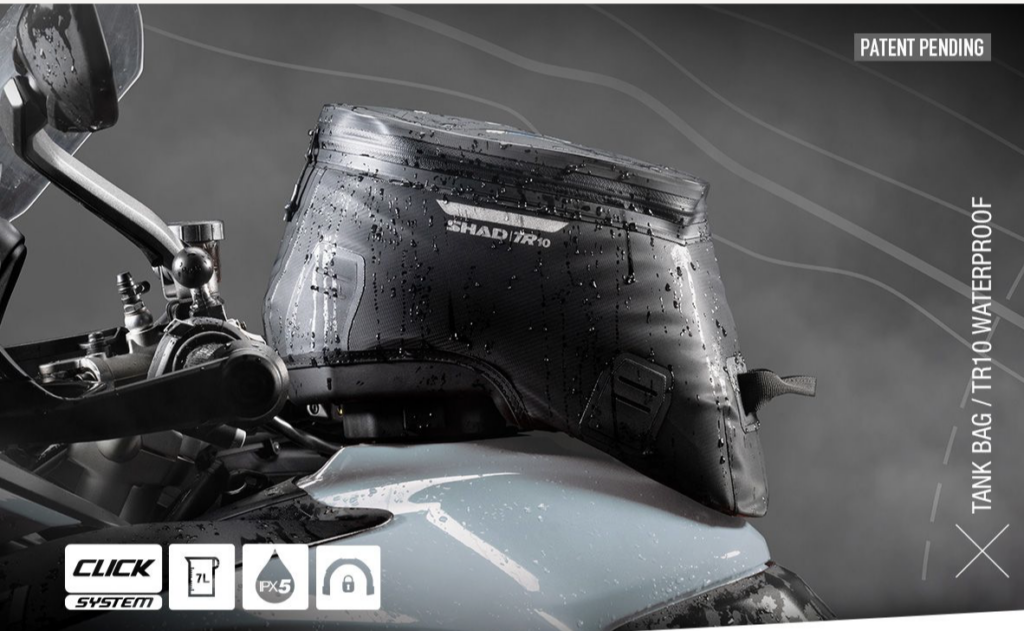 La prima proposta SHAD è la borsa da serbatoio TERRA TR10 dal design ergonomico che si adatta a tutti i tipi di moto. Realizzata con materiali tecnici premium, è pronta a garantire eccellenti prestazioni. TR10 ha una capacità di 7 litri e consente al motociclista un comodo accesso nella parte interna, mentre la sua impermeabilità, garantita dal materiale con cui è realizzata (conforme agli standard IPX5), la cerniera e uno scomparto principale isolato, assicurano al contenuto di rimanere asciutto anche in condizioni meteo molto avverse. TR10 mantiene la forma anche se vuota, grazie alla sua struttura semirigida. Si abbina perfettamente alle valigie laterali TERRA e alla borsa laterale impermeabile TR30. Include, inoltre, un sistema di sicurezza che consente il blocco con chiave alla moto. Il robusto e compatto sistema di attacco Click System permette il rapido posizionamento sulla moto, semplice come lo sbloccaggio grazie al pulsante incorporato. Il sistema si integra perfettamente con il serbatoio anche dal punto di vista estetico. Prezzo al pubblico € 125.
