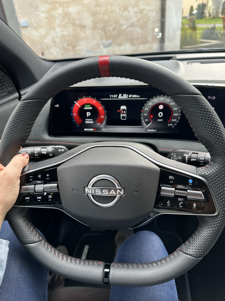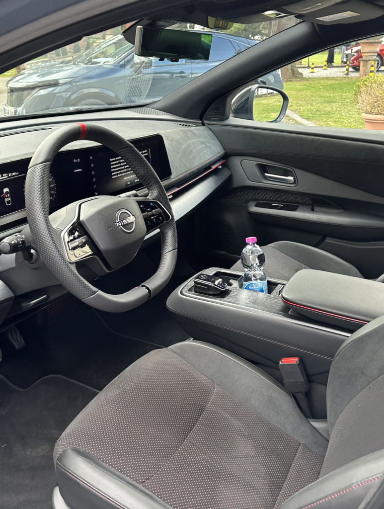 Gli interni sono stati completamente ridisegnati, realizzati con materiali di qualità superiore e finiture di pregio. I sedili sono progettati per la guida sportiva, garantendo supporto e postura ottimali. Cuciture rosse sul volante e accenti rossi, tipici del marchio NISMO, conferiscono all’abitacolo un carattere sportivo e un senso di alta qualità. L’eleganza degli interni è esaltata dalle venature del legno scuro presente in tutto l’abitacolo. L’illuminazione rossa ANDON di Nissan, caratteristica del marchio, contribuisce a creare un’atmosfera suggestiva.