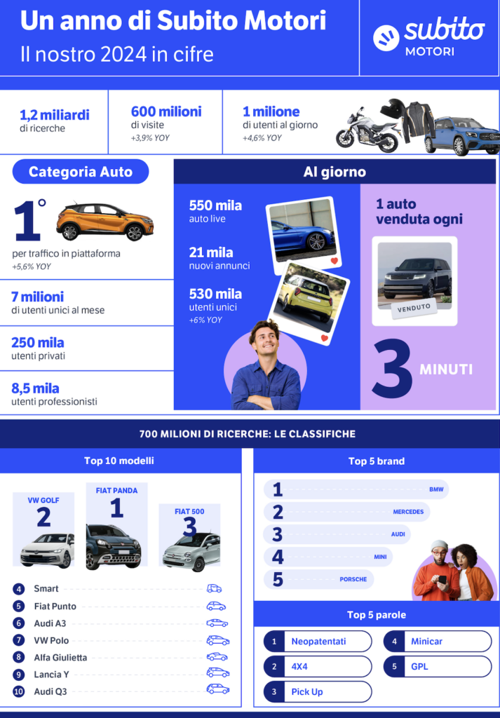 “Subito Motori è lo strumento più potente per mettere in contatto chi cerca un’auto con chi la vende, che si tratti di privati o di professionisti. Grazie a una piattaforma che offre un’esperienza semplice, veloce ed efficace alla community più grande d’Italia, nel “parco auto” più grande d’Italia, siamo orgogliosi di dire che nel 2024 è stata venduta tramite Subito 1 auto ogni 3 minuti” afferma Andrea Volontè, Sales Director di Subito. “Subito Motori è davvero il luogo dove è possibile trovare qualsiasi auto, anche le più inaspettate: dalla Panda alla Porsche, dall’utilitaria all’auto d’epoca, dall’affare all’auto di lusso. E anche soddisfare qualsiasi esigenza: dal mezzo da lavoro all’auto status symbol; dalla scelta funzionale alla realizzazione del sogno di una vita. Perché ogni auto usata è unica e irripetibile, e ogni auto usata ha il suo proprietario. A noi spetta il delicato compito di agevolare l’incontro”, chiude Andrea Volontè.