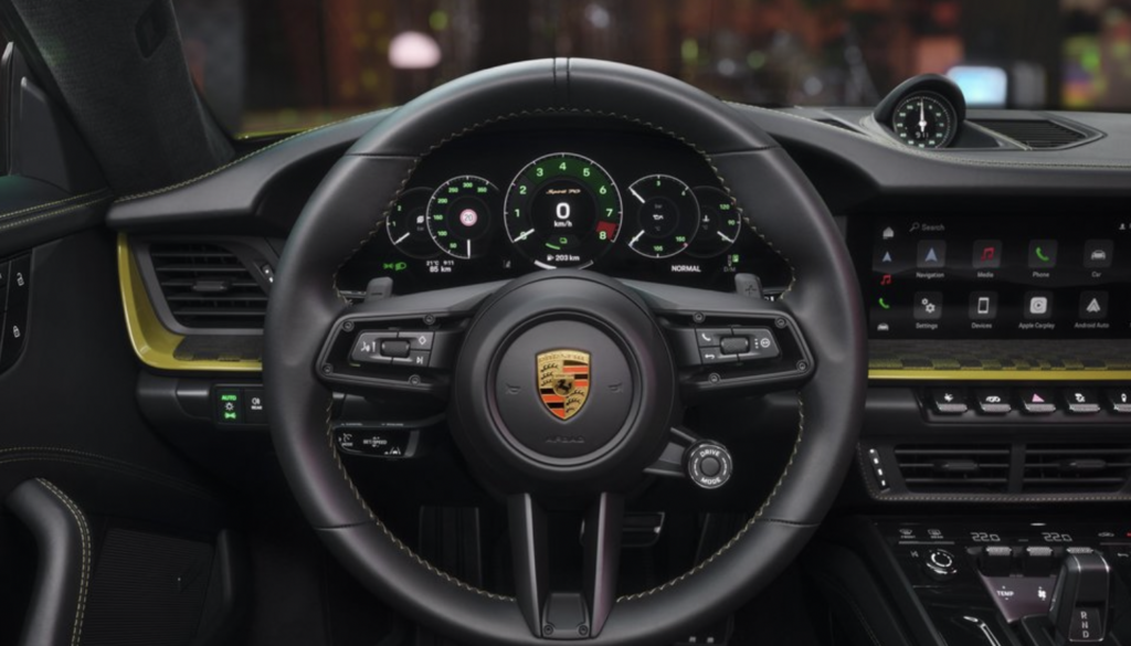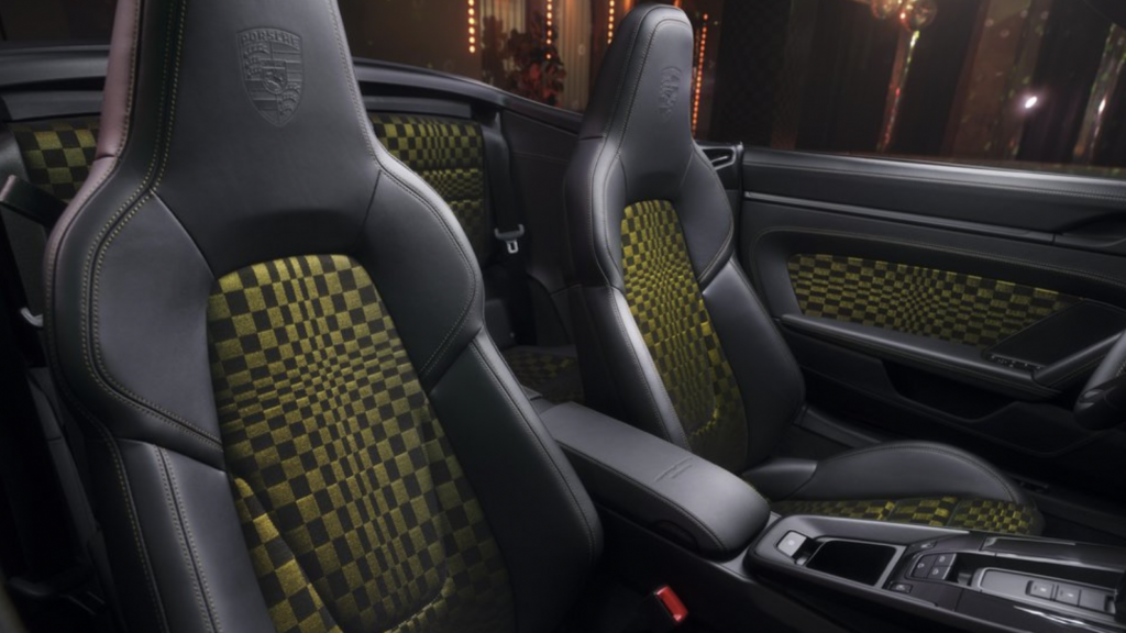 Il punto forte dell’abitacolo è l’iconico motivo del tessuto Pasha in Nero/Olive Neo. La grafica del tessuto ricorda una bandiera a scacchi sventolante. I rettangoli di diverse dimensioni, sapientemente disposti, creano una sorta di movimento nel disegno. Anziché il velluto jacquard come in passato, la 911 Spirit 70 utilizza un tessuto composto da fibre floccate, che si distingue per il carattere ancora più sportivo, la consistenza più gradevole al tatto e il maggior confort, soprattutto nei viaggi più lunghi. Il motivo Pasha viene utilizzato per rivestire la parte centrale dei sedili sportivi Plus a 18 vie, gli specchietti retrovisori esterni e persino l’interno del vano portaoggetti. Anche gli inserti decorativi degli schienali dei sedili e i profili della plancia sono disponibili a richiesta con il motivo Pasha. La dotazione di serie comprende anche un tappetino reversibile per il bagagliaio, sempre con disegno Pasha. L’elegante rivestimento in pelle club nero basalto con impunture decorative in Olive Neo e il pacchetto interni in pelle club nero basalto sono anch’essi offerti di serie. Il quadro strumenti coniuga uno stile classico con tecnologia all’avanguardia. Il display ad alta risoluzione da 12,65 pollici è caratterizzato da indicatori bianchi e linee di scala in formato analogico. Le cifre verdi ricordano la leggendaria Porsche 356 e la scritta del modello è elegantemente integrata nel contagiri completamente digitale. Lancette bianche e numeri verdi si ritrovano anche nella versione speciale del cronometro Sport Chrono.