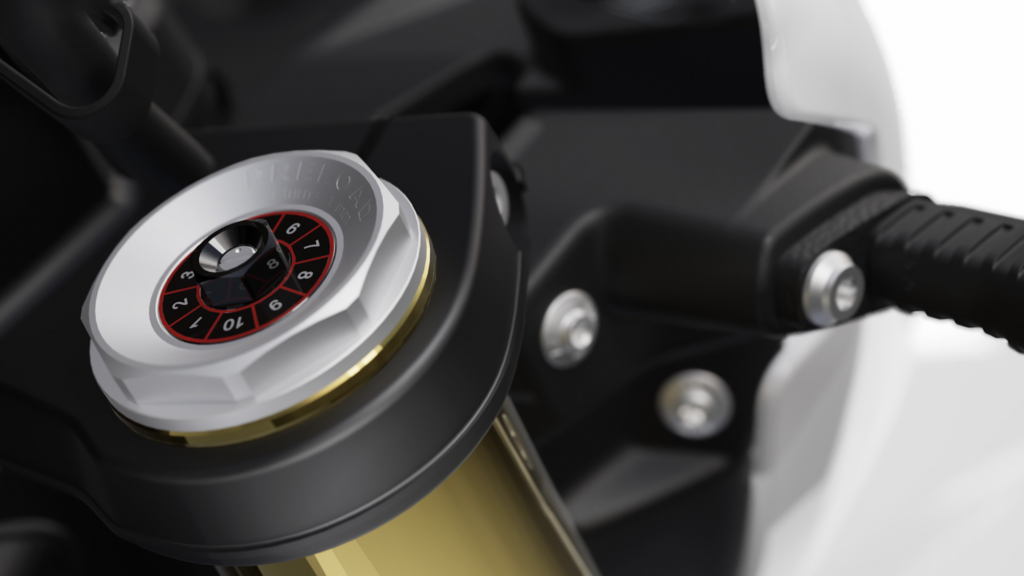 Verniciatura Light White per parafango anteriore, carenatura del cockpit, serbatoio carburante, coperchio airbox e parte posteriore. Sella: rossa.