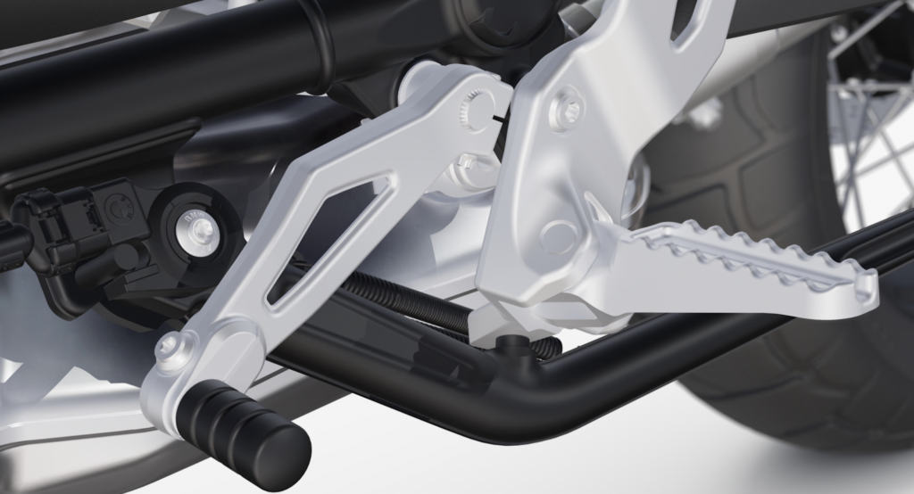 La versione base della nuova BMW R 12 G/S monta un sistema di pedane progettato principalmente per l’uso su strada, ma adatto anche al fuoristrada grazie al suo profilo dentellato. Nell’ Enduro Package Pro è invece incluso un sistema di pedane enduro che, grazie all’ampia superficie di contatto e a tre file di dentini, assicura la massima aderenza nella guida off-road.