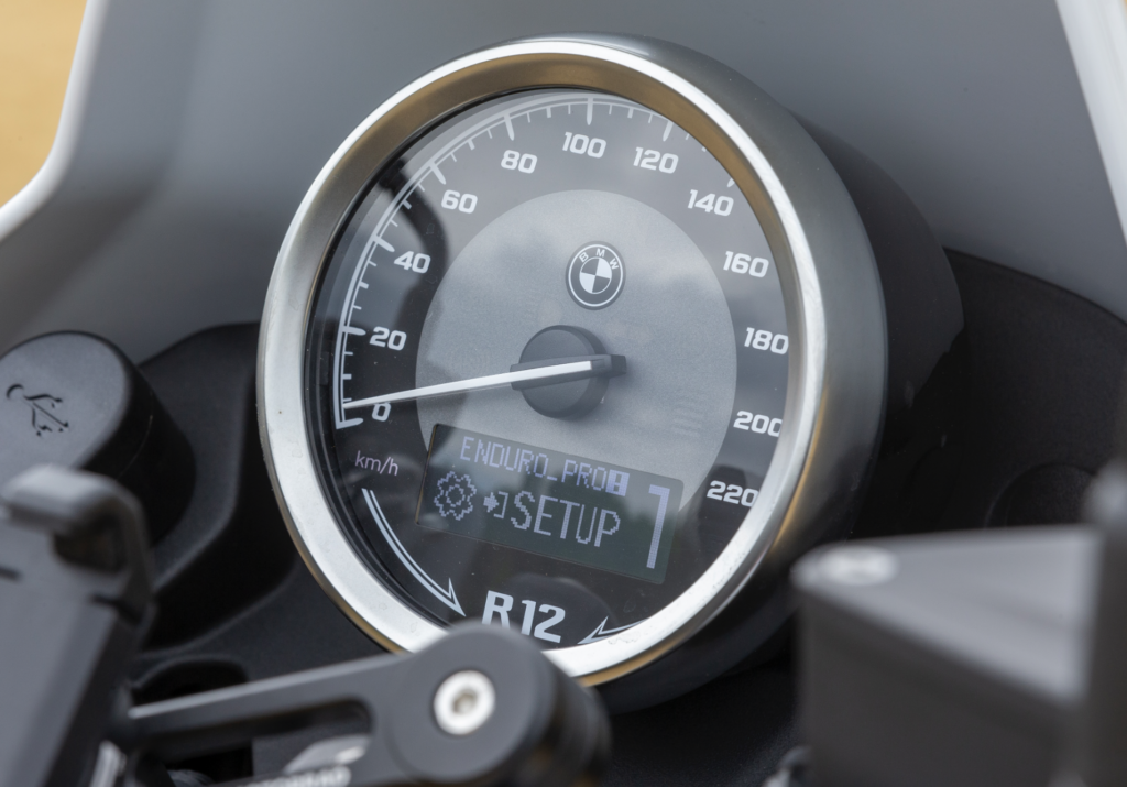 La nuova BMW R 12 G/S è equipaggiata di serie con uno strumento circolare dal design classico, posizionato al centro del cruscotto, e con una presa da 12 V collocata sul lato destro per l’alimentazione di bordo.