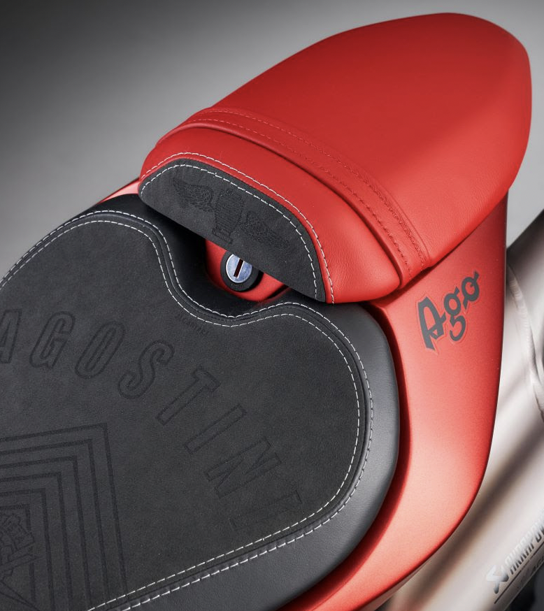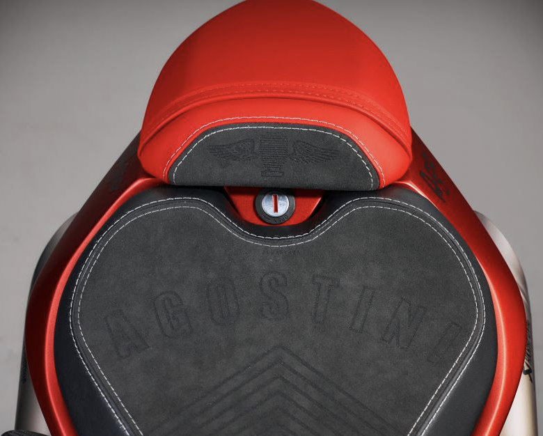A completare il tutto, una personalizzazione esclusiva realizzata tramite incisione a laser: il nome “Agostini”, le iconiche strisce a freccia ispirate alla tuta da gara del campione e il logo MV Agusta, contornate da un ricamo bianco.