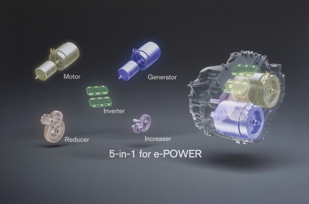 A differenza degli ibridi tradizionali, nel sistema e-POWER la potenza generata dal motore termico non è mai trasmessa direttamente alle ruote.