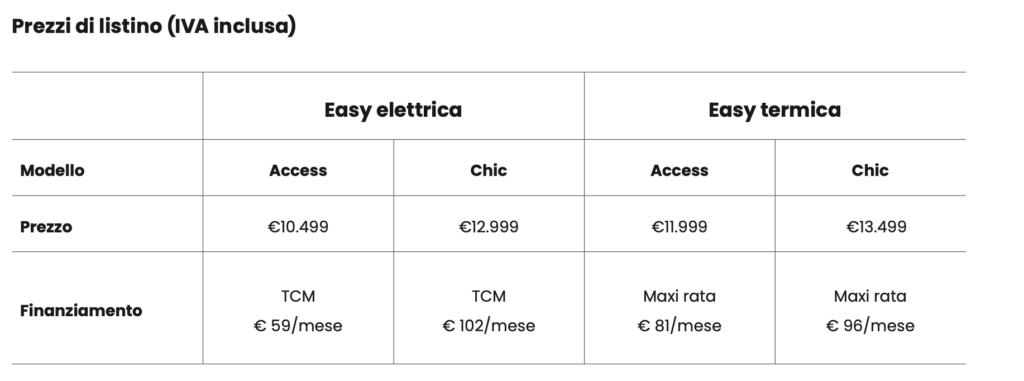 Easy è disponibile in versione termica oppure elettrica e presenta due modelli: Easy Access, la soluzione più essenziale, pensata per chi cerca semplicità e praticità, e Easy Chic. In questo caso l’allestimento è più completo, disponibile sia per elettrico (7,5 kWh) sia per il termico, con dotazioni come cerchi in lega da 14”, finiture interne in tinta carrozzeria, altoparlanti Bluetooth, ferma carico, luce 3° stop a led, aletta parasole e maniglia di sostegno lato passeggero.