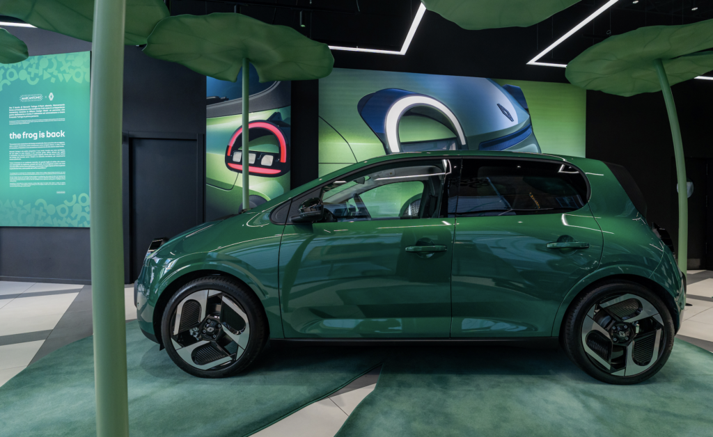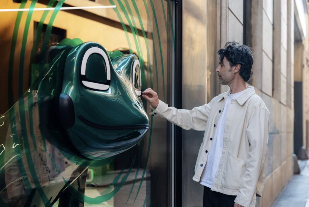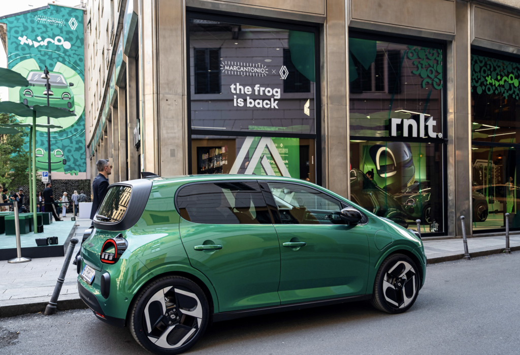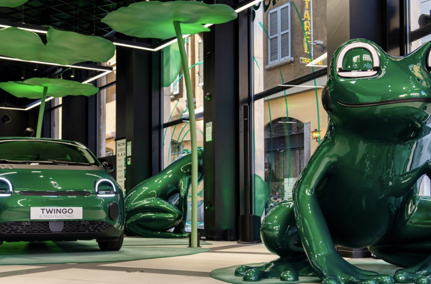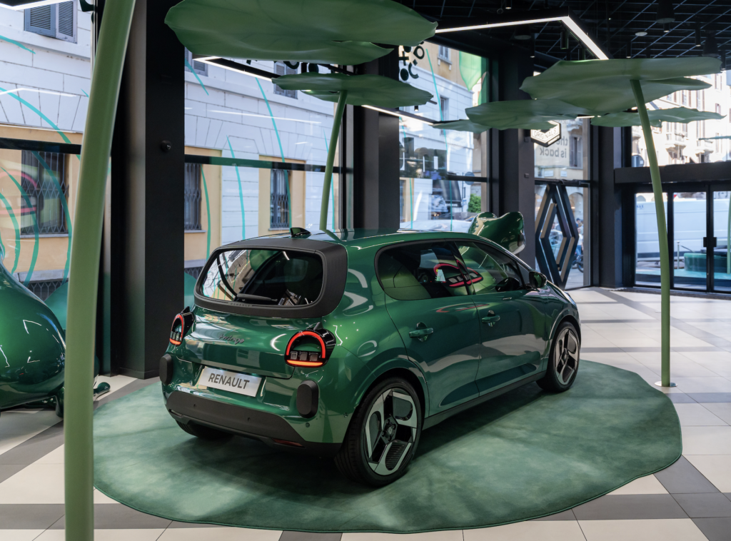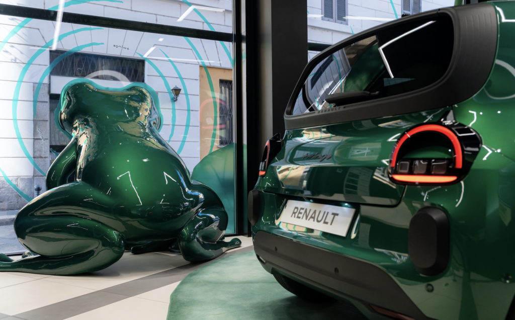 All’interno dello store, i visitatori entrano in uno stagno urbano onirico, fatto di grandi ninfee, suoni della natura e giochi di scala che ribaltano i punti di vista. Al centro, Renault Twingo ETech Electric dialoga con una grande scultura di rana, realizzata da Marcantonio e rifinita nello stesso colore dell’auto: occhi, guance e sorriso riprendono i tratti iconici del frontale dell’auto, creando un rimando ironico e poetico.