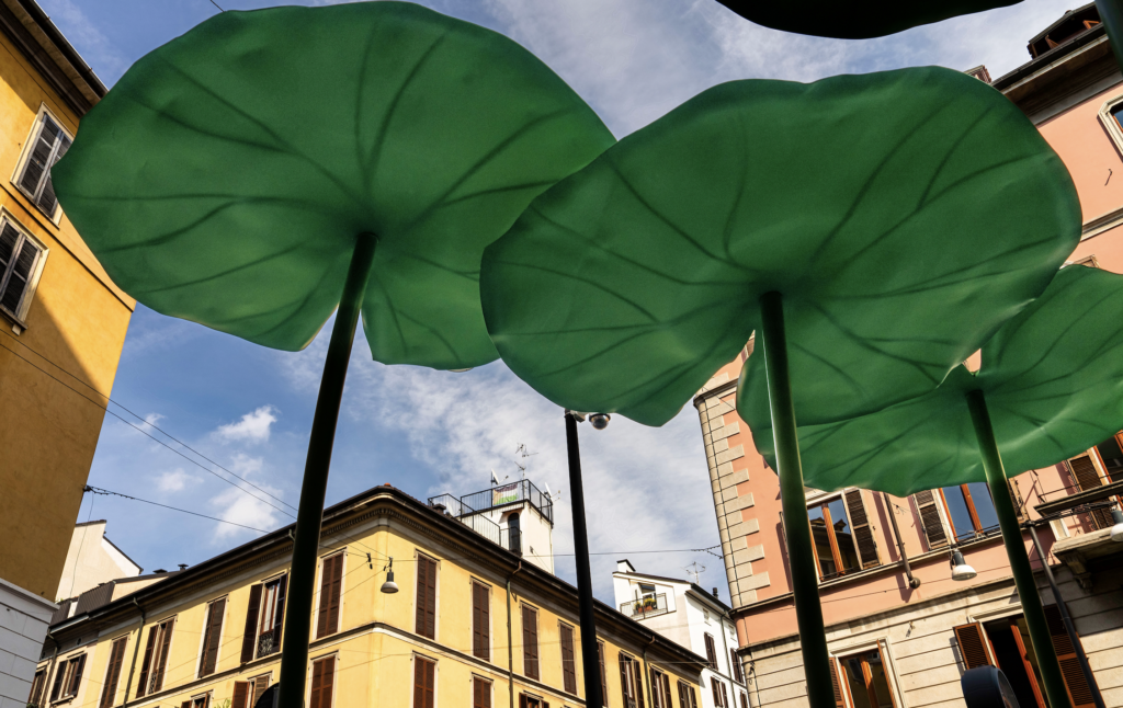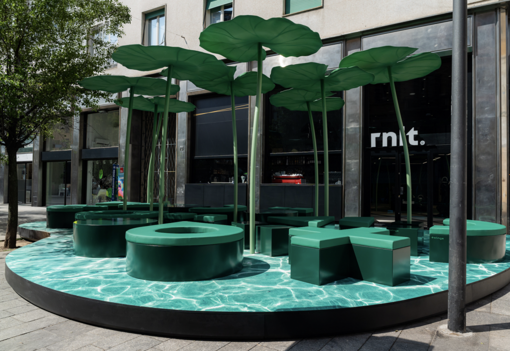 L’esperienza prosegue all’esterno: la lounge sotto le ninfee con le sedute ispirate al Twingo alphabet, le vetrine trasformate in superfici liquide e un grande murales che estende il racconto nello spazio urbano. Un percorso continuo che invita a fermarsi, osservare, fotografare e – soprattutto – entrare.