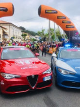 Quattro ruote protagoniste al traguardo: la Giulia Veloce della Polizia insieme alla Giulia Veloce auto ufficiale del Giro D’Italia.